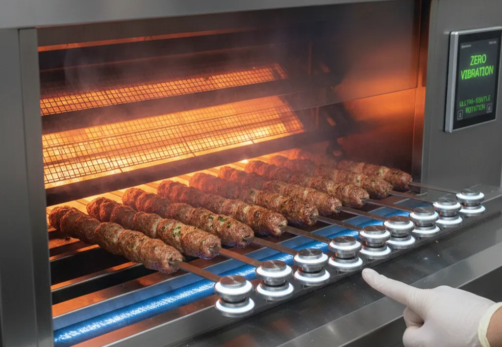 - واحدهای با تقاضای بالا یا فستفودهای زنجیرهای: کبابپز ریلی اتوماتیک با کنترل دیجیتال، ظرفیت 500 تا 1200 سیخ در ساعت و ساختار تمام استیل جهت طول عمر بالا.