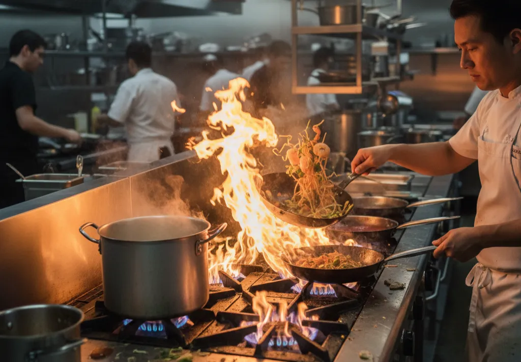 در حوزه تجهیزات آشپزخانه صنعتی، شعله اجاق گاز صنعتی از گاز شهری یا کپسول تأمین میشود و با مشعلهای چدنی یا فولادی توزیع یکنواخت حرارت ایجاد میکند. این شعله در مدلهای مختلف، از شعلههای کوچک برای پخت ظریف تا شعلههای بزرگ برای قابلمههای صنعتی، طراحی میشود. کنترل شدت شعله با شیرهای دقیق، دقت در دما را تضمین میکند.