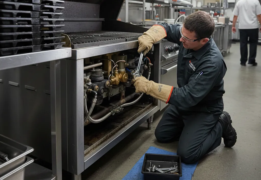 برای تعمیر کباب پز صنعتی در این بخش، اول شیر را کامل تمیز کنید، فندک را با سمباده نرم برق بیندازید و ترموکوپل را چک کنید که کثیف یا خم نشده باشد. اگر مشکل حل نشد، شیر گاز ایمنی یا ترموکوپل باید تعویض شود؛ کاری که حتماً باید توسط تکنسین مجاز انجام شود تا خطر نشتی گاز نداشته باشد.